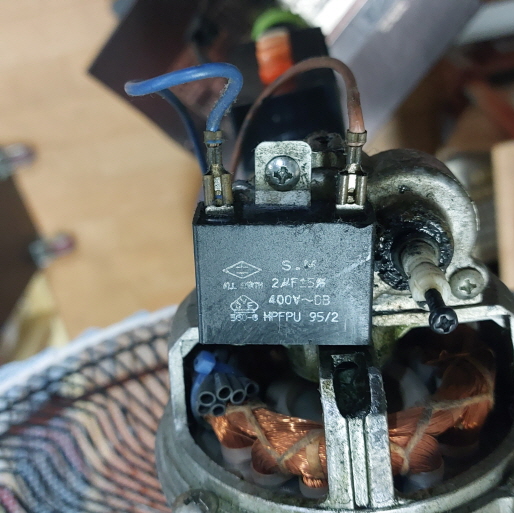 모터 회전도 미약하여 콘덴서 불량을 의심했습니다. 날개도 박살났고. 회전축도 고장.