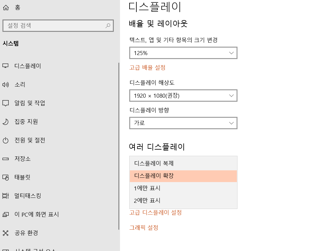 - 하단 [디스플레이 여러 개] → 아래 옵션 중 선택