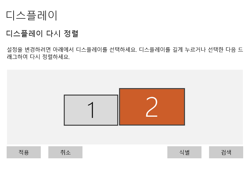 --- 위의 사진처럼 식별클리해서 각 모니터의 배치를 확인하고 그에 따라 마우스로 드래그해서 재배치합니다.