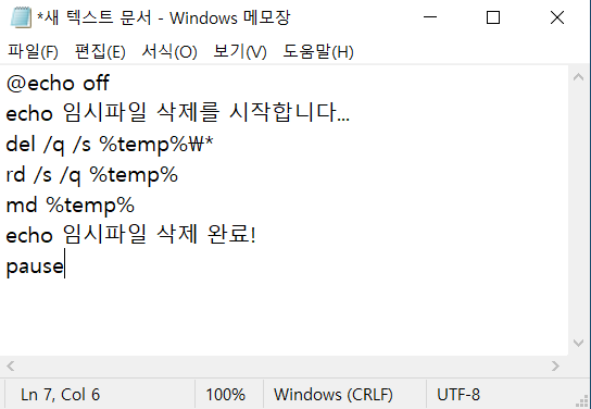 2. temp_delete.bat 라는 이름으로 저장 (파일형식: 모든 파일, 확장자: .bat)