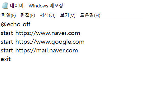 - 네이버.bat 라는 이름으로 저장 (파일형식: 모든 파일, 확장자 .bat)
