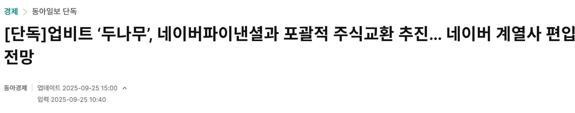 | 레벨 3 | 매우 높음 | 주요 언론 단독 + 공시 / “인수합병”, “주식교환”, “정부 정책 확정” / 추세 전환·기관 매수 동반 | “네이버-두나무 포괄적 주식교환 보도” |