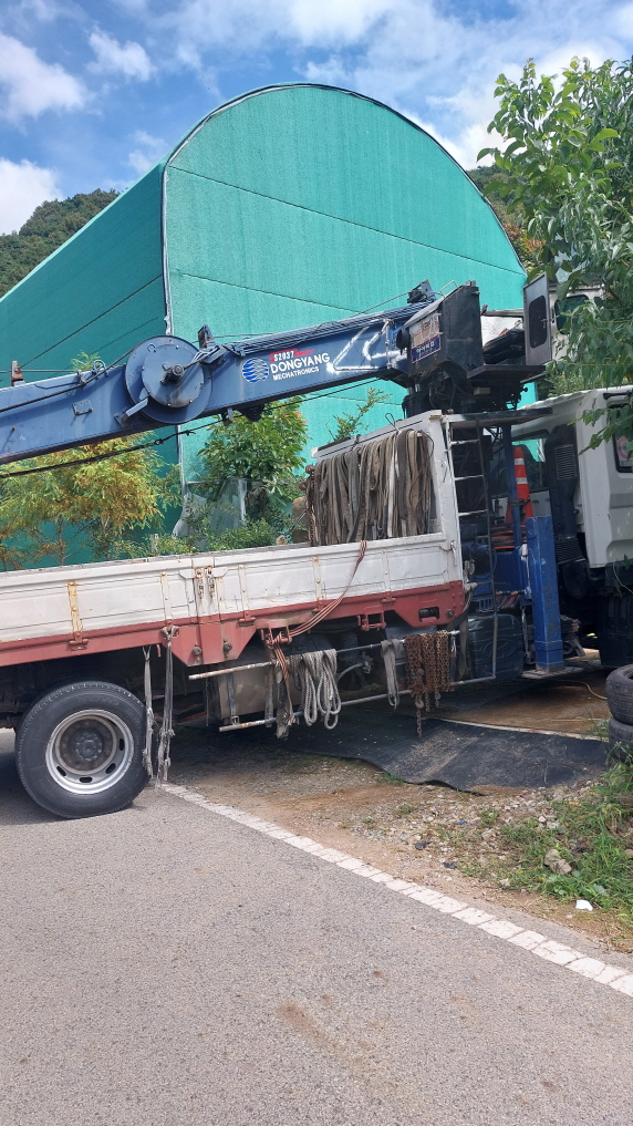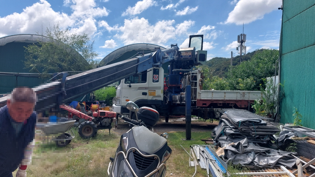 농장 구역 특성상 무거운 장비를 직접 옮기기 어려워 7톤 크레인 트럭을 불러서 자재를 내렸습니다.