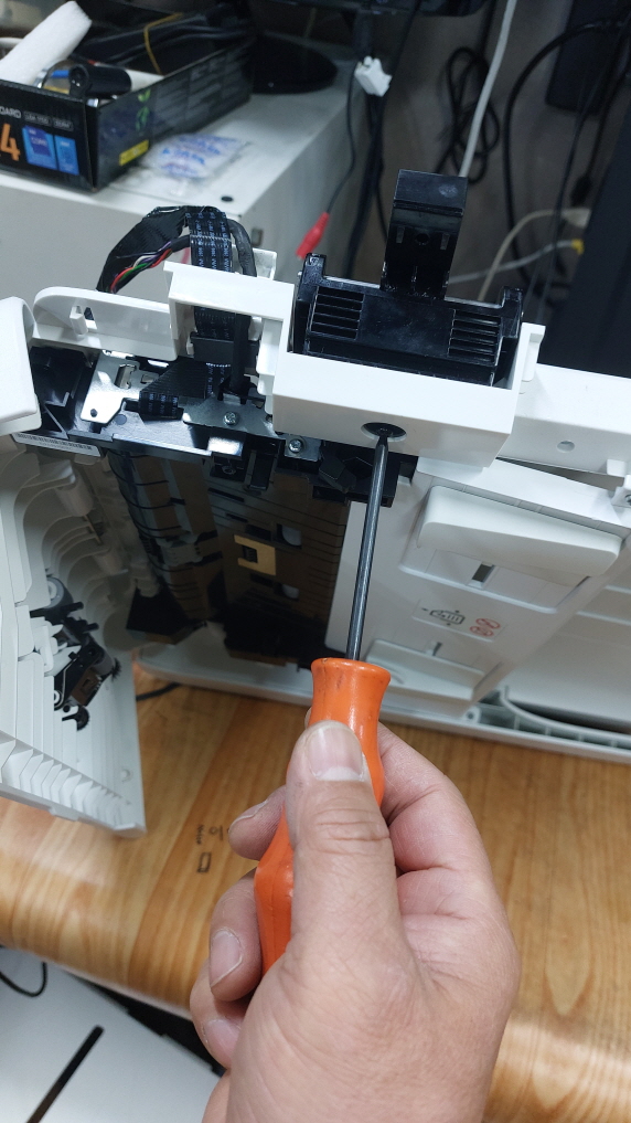 - 핵심 포인트: ADF 상판과 본체를 연결하는 힌지 부위의 나사를 제거합니다. 좁은 틈새에 나사가 위치해 있으니 길이가 긴 드라이버를 사용하는 것이 훨씬 수월합니다.