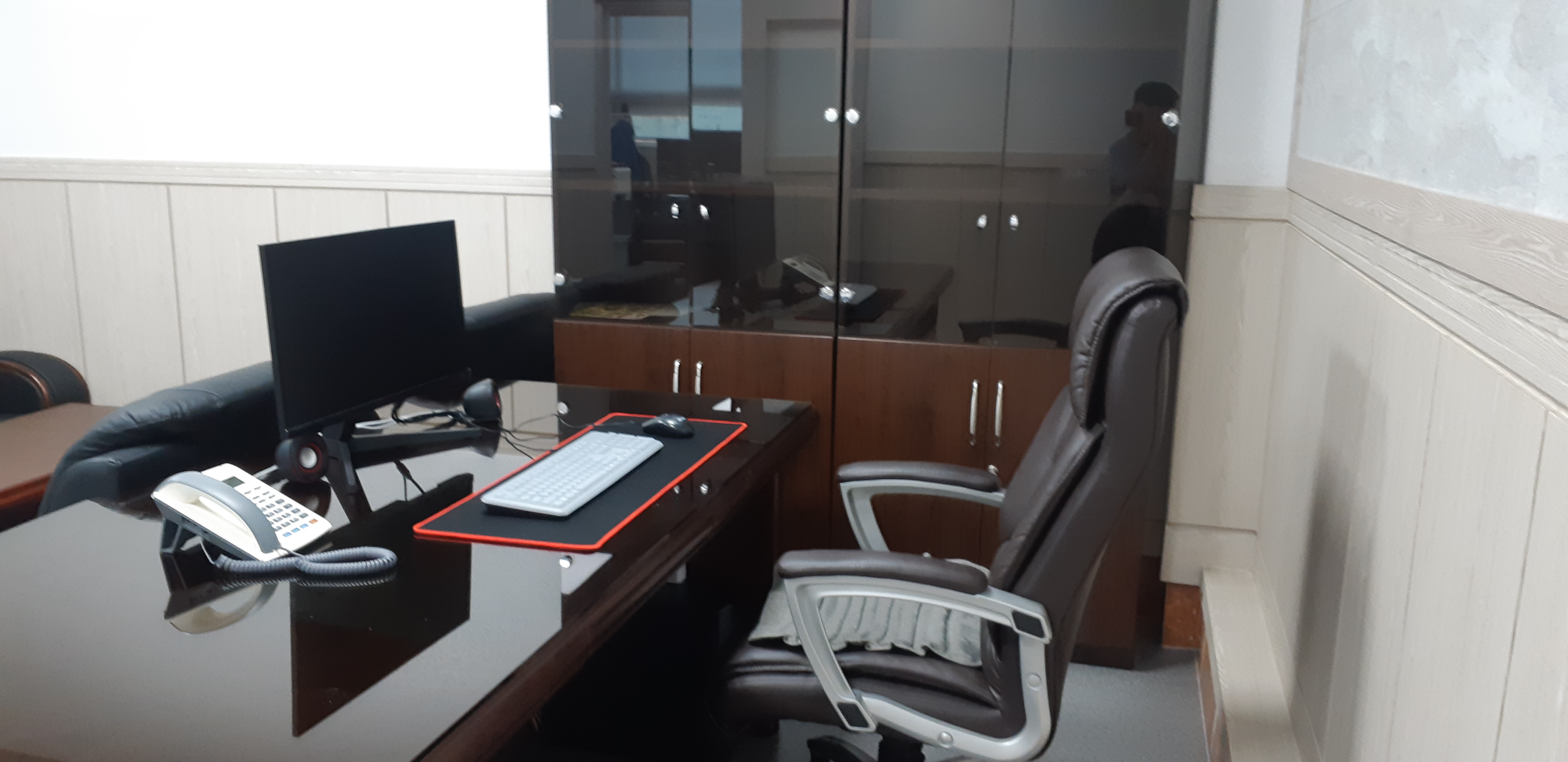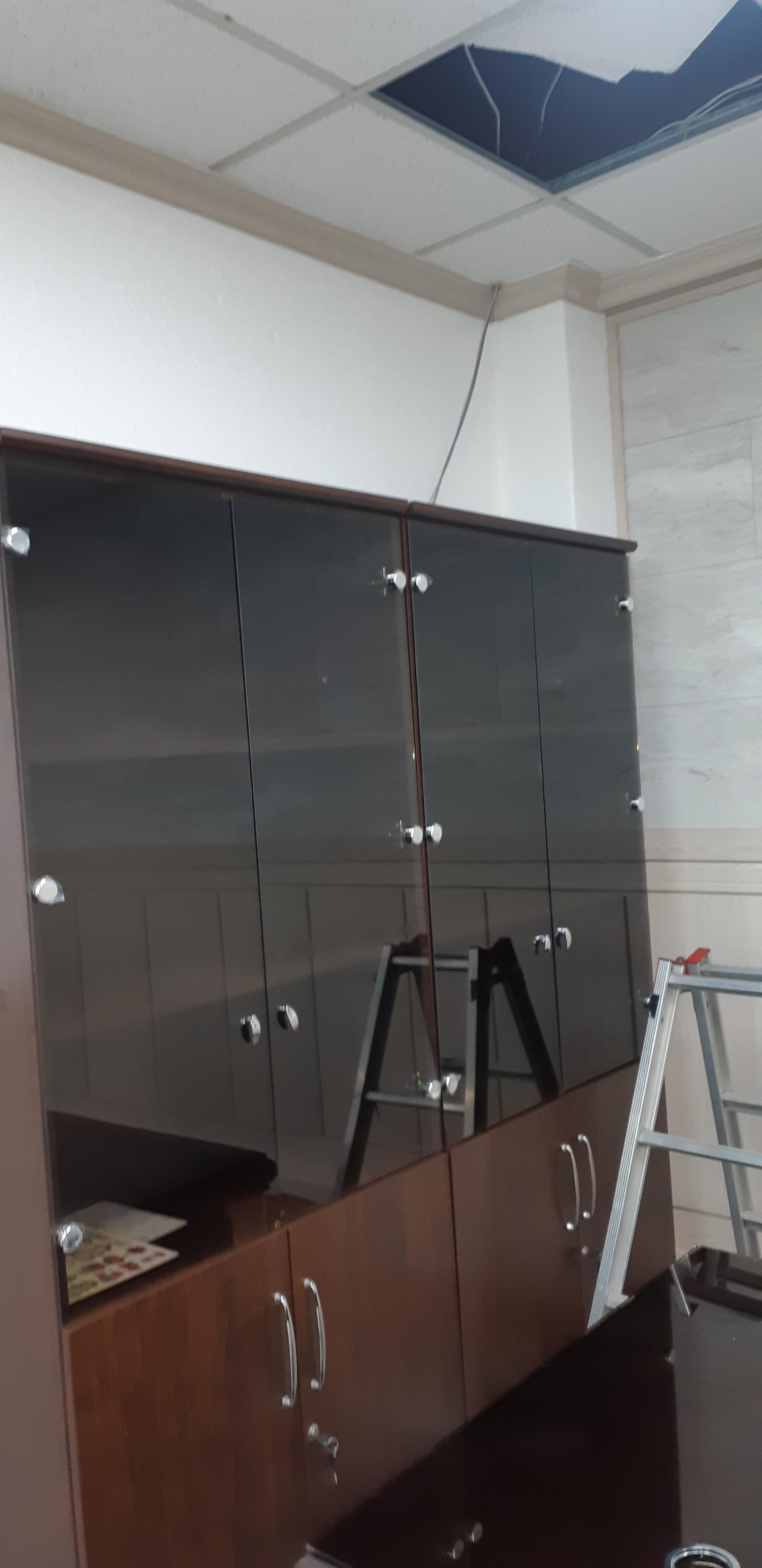 건너편 사장실로 선이 나왔습니다. 가구들이 비싸서 아주 조심조심 합니다. 저 번에는 사무실 천장에 발로 구멍을 내어서 거거 해결한다고 혼났습니다.