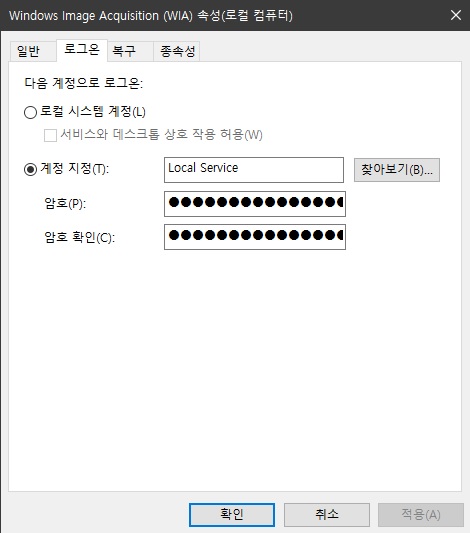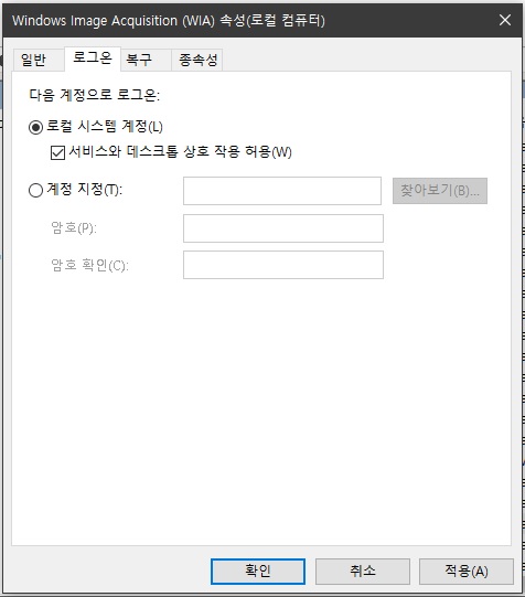 ---5. 로컬시스템계정에 체크하고 서비스와 데스크톱 상호작용 허용에도 체크합니다.