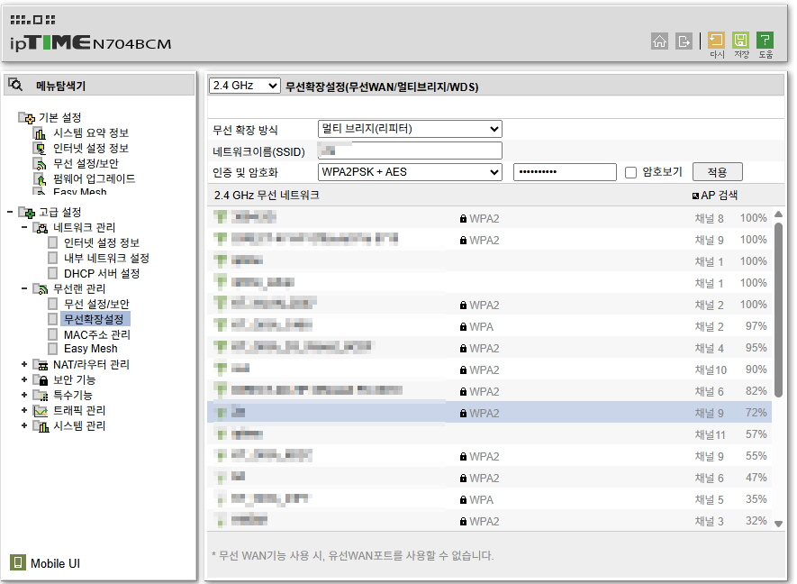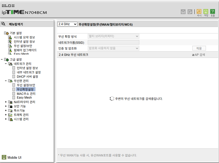 - 무선확장- 무선브릿지선택하고 AP검색을 합니다.