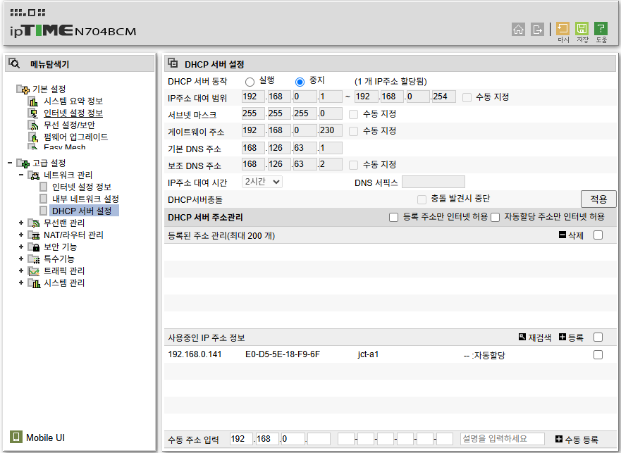 - 내부 공유기의 DHCP 서버는 비활성화하는 것이 충돌 방지에 좋습니다.