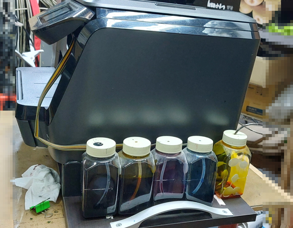 잉크 넘침 문제를 근본적으로 해결하기 위해 이번에는 별도의 대용량 폐잉크통을 장착했습니다. 기존의 작은 용량 폐잉크통으로는 잦은 넘침 문제가 발생할 수 있어, 좀 더 넉넉한 크기의 폐잉크통으로 교체하여 지속적인 사용을 고려했습니다. 각 색상의 잉크통을 따로 분리하여 관리하기 쉽게 구성했습니다.