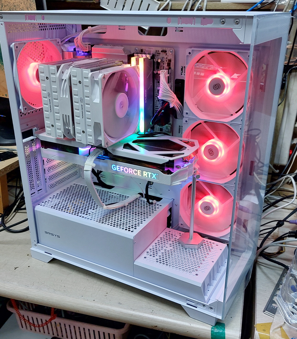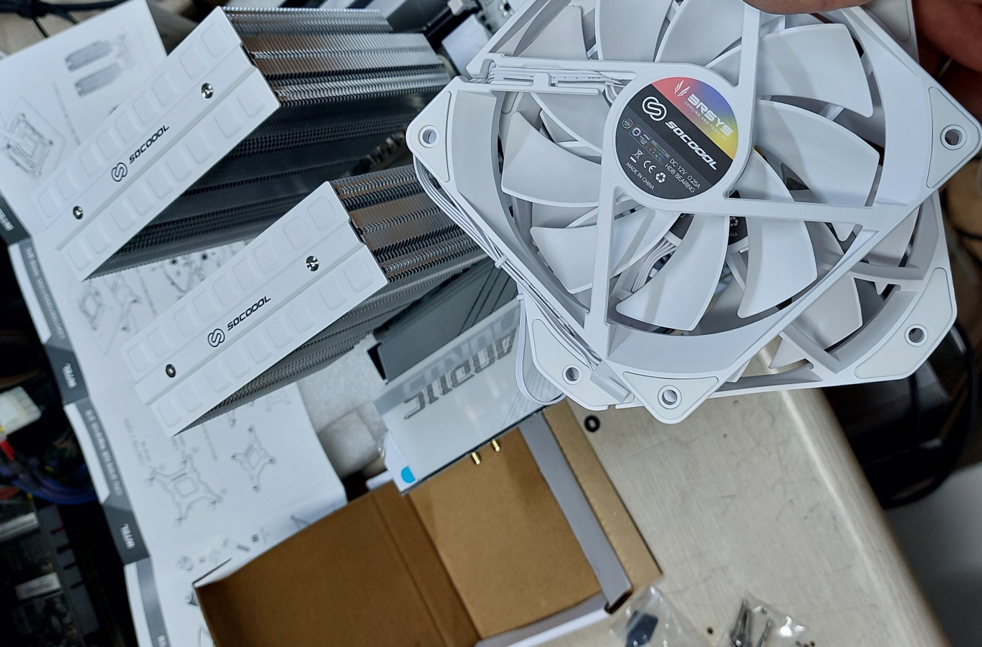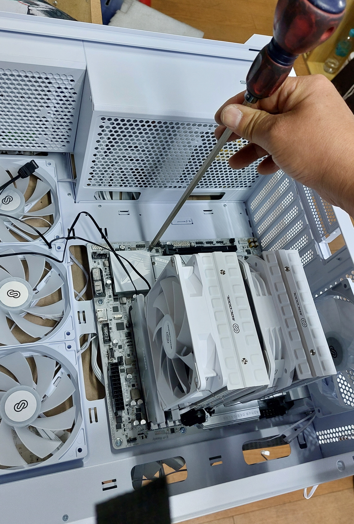 가장 손이 많이 간 부분은 바로 쿨러 설치였습니다. Socool의 듀얼 타워 쿨러는 생각보다 크고 묵직해서 고정하는 데 꽤나 애를 먹었죠. 하지만 팬을 장착하고 나니 멋진 RGB 효과가 더해져서 더할 나위 없이 만족스러웠습니다.
