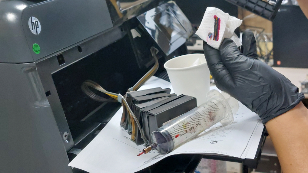 - 모은 잉크를 헤드에 넣을 주사기에 주입을 한다.( 세정제로해서 빨강쪽 뚫고나서 빨간잉크를 주입하면 바로 빨간색이 나옴)