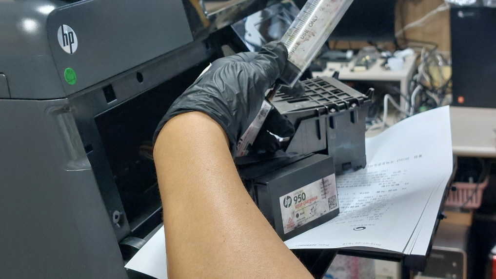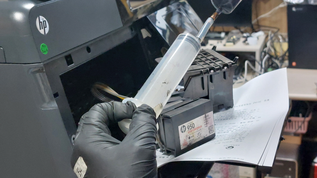 - 주사기로 새 마젠타 잉크를 천천히 넣어줍니다.