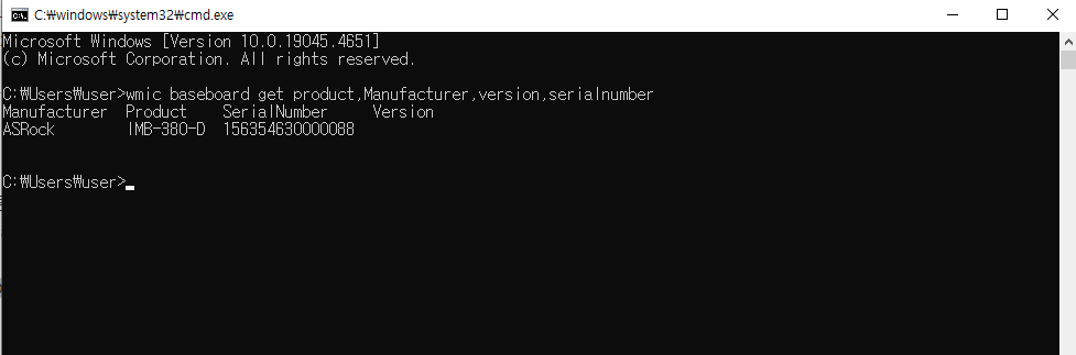 wmic baseboard get product,Manufacturer,version,serialnumber